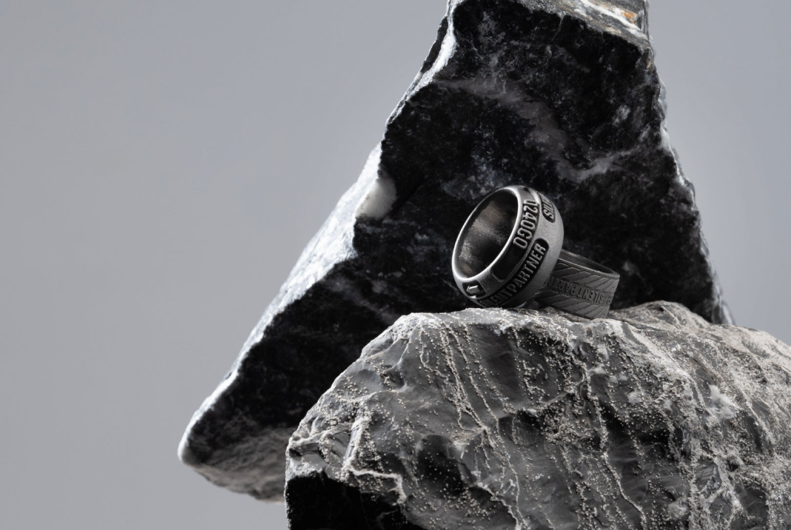 Ultra-light titanium ring with a carving pattern and brand name, laser-engraved. The product is presented in natural gray and black colors. Matherial: titanium